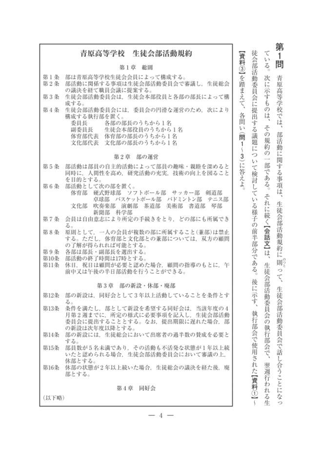 設問①資料&会話文読解「部活動に関する生徒会執行部での話し合い」